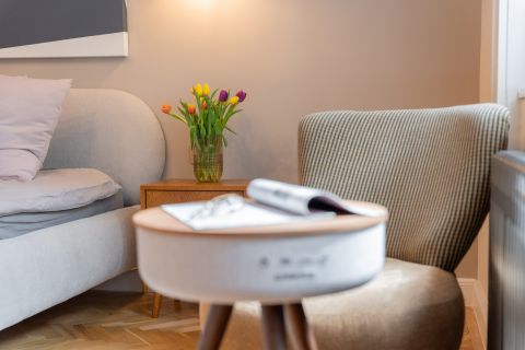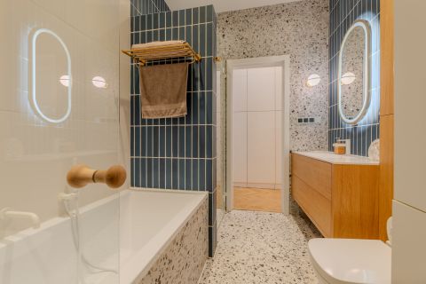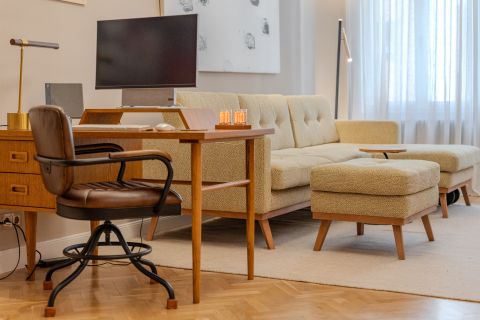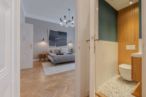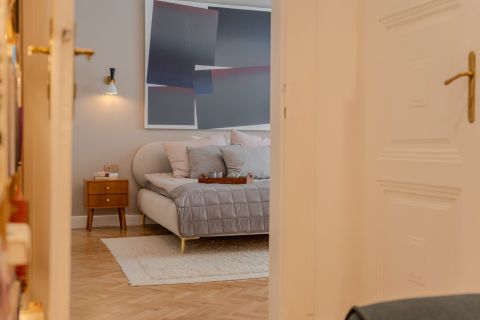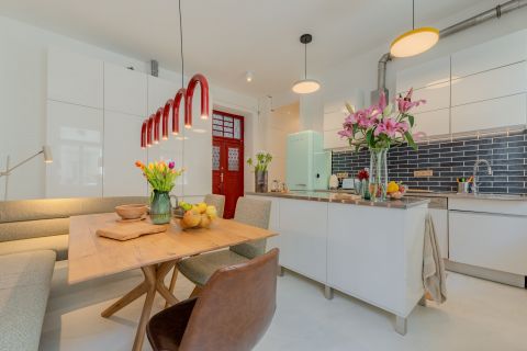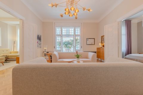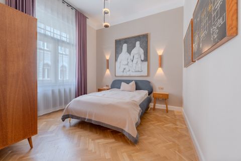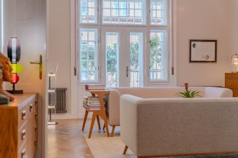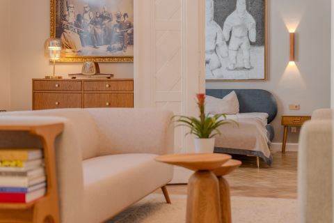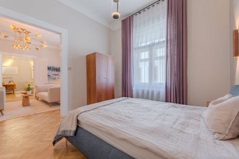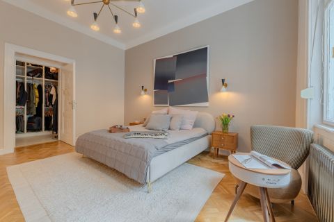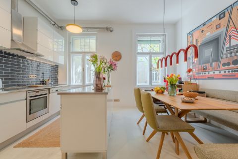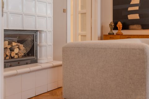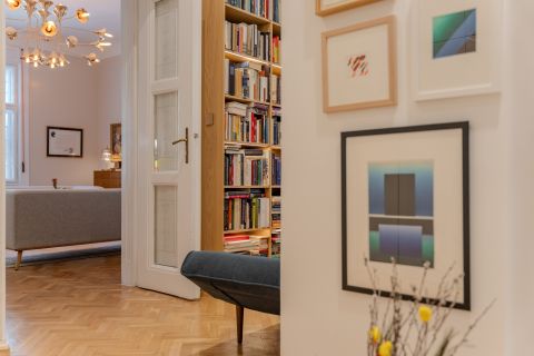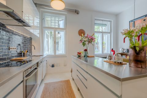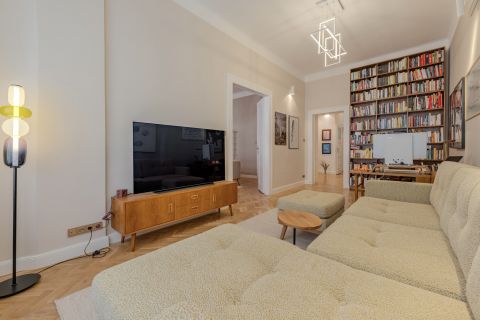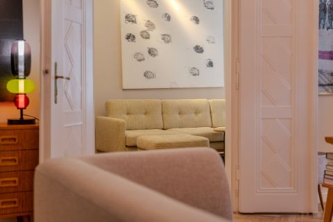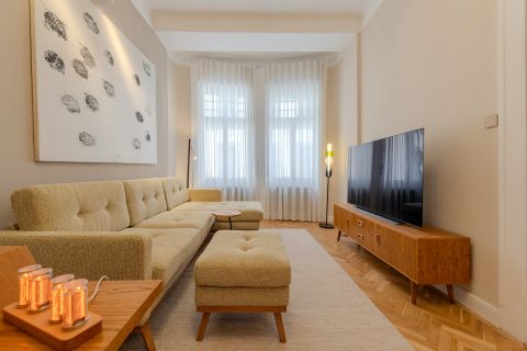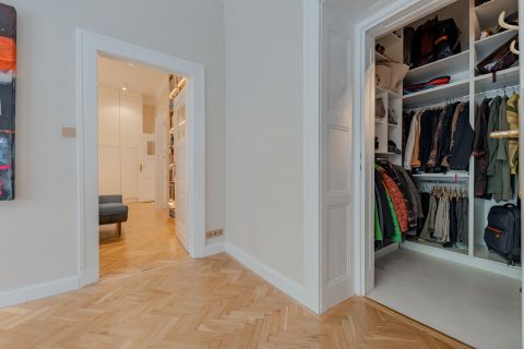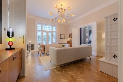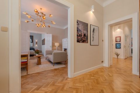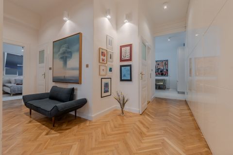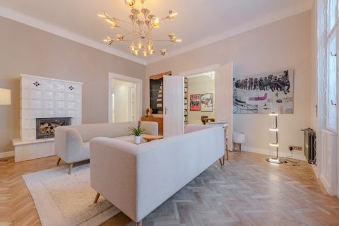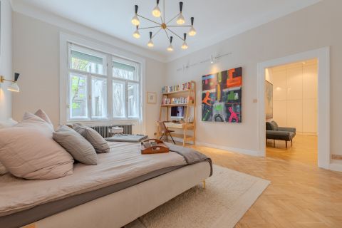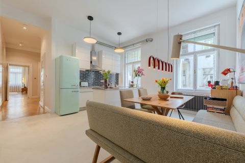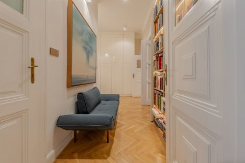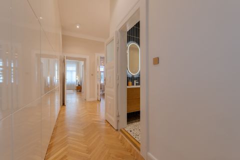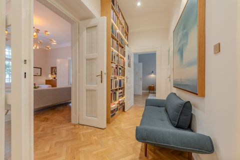 A lakás világos, tágas és rendkívül egyedi hangulatú, ahol a klasszikus nagypolgári elegancia és a modern funkcionalitás harmonikusan jelenik meg.