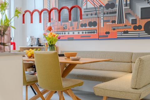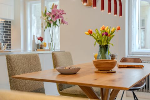 A terek jól elkülönülnek, mégis harmonikus egységet alkotnak, így a lakás egyszerre reprezentatív és élhető.