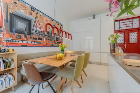The apartment combines classic grand bourgeois elegance with modern simplicity and artistic flair. High ceilings, well-proportioned rooms, and refined details create a distinctive and inspiring living environment.