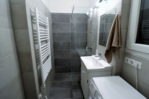 A 21 nm-es amerikai konyhás - nappali klimatizált. A szobák külön nyílóak, a nagyobbik szobához gardrób tartozik. A kényelmes fürdő zuhannyal szerelt, itt kapott még helyet a mosógép. A bejárat mellett egy vendég toalett került kialakításra.