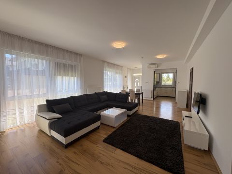 Az ingatlanhoz tartozik egy 30 nm-es részben fedett terasz, garázs 2 autónak és egy 350 m²-es rendezett közös udvar.