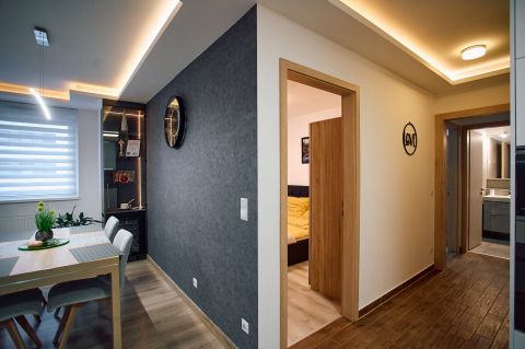 Az ingatlan modern, egyedi belsőépítészeti megoldásokkal készült, amelyek harmóniát és eleganciát sugároznak.