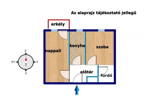 A 42 nm + erkélyes ingatlanban, nagy nappali, egy hálószoba, konyha,