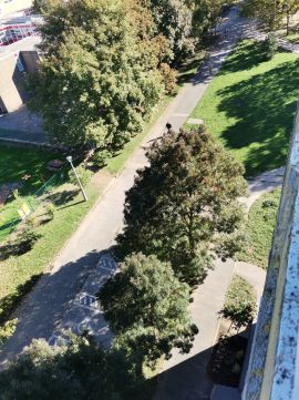 A lakótelep szélén, tágas parkolóval, rendezett környéken, tiszta,