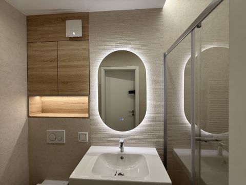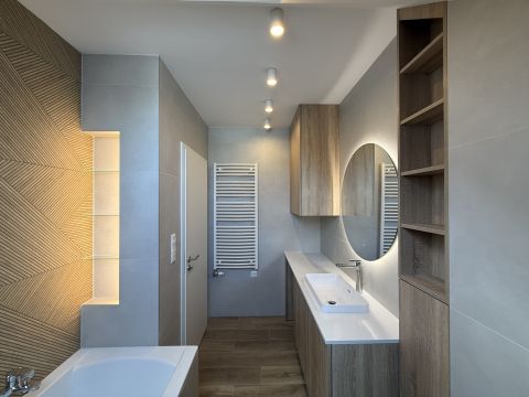 Belsőépítész tervek alapján prémium minőségű burkolatokkal, szaniterekkel, egyedi gyártású beépített bútorokkal (konyha, fürdő, előtér) és dekoratív világítással!