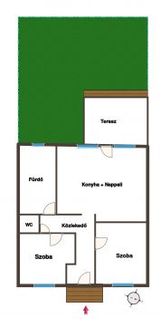 Elosztás: amerikai konyha + nappali, 2 hálószoba, fürdőszoba, külön WC