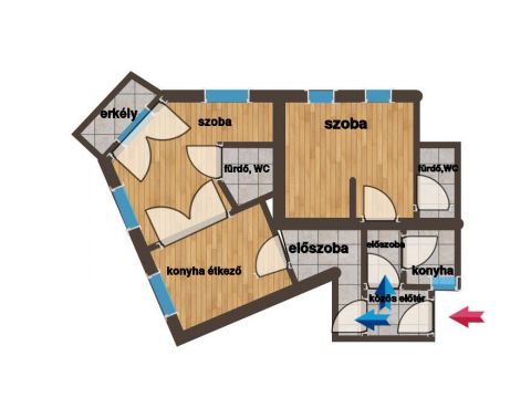 A lakás két apartmanra lett osztva, melynek bejáratai egy közös előszobából nyílnak.