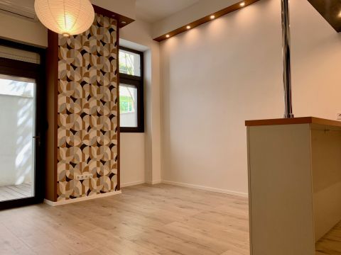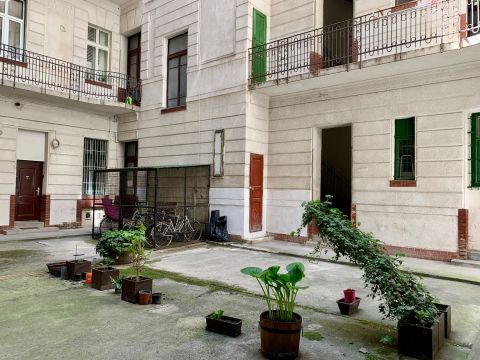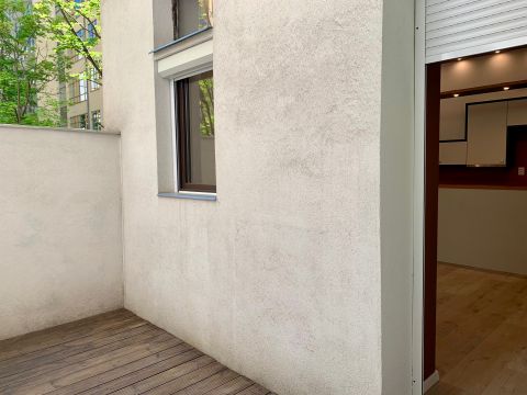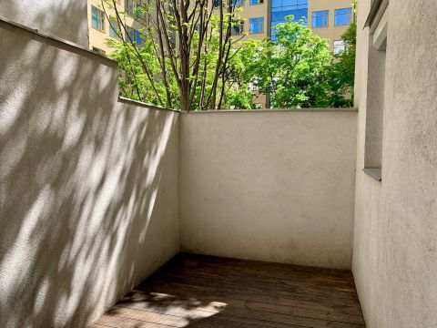 A lakás plusz adottsága a nappaliból megközelíthető teraszként használható, napfényes és világos társasházi lichthof, mely szintén modern burkolatot kapott a felújítás során.
