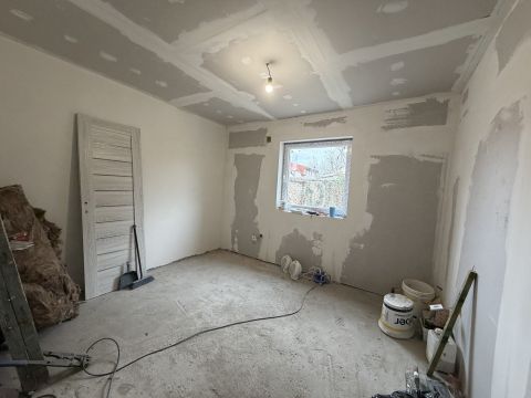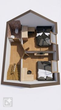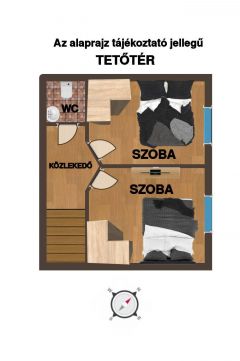 A ház belsőépítészeti elrendezése kétszintes. Az alsó szinten egy tágas nappali fogad, mellette található egy külön szoba, amely ideális lehet szülői hálónak, vendégszobának, dolgozószobának, valamint egy vizesblokk. A felső szint, amely a tetőteret foglalja el, két hálószobát és egy újabb vizesblokkot kínál, így összességében nagyobb családok számára is kiváló választás.