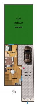 A házrész saját udvarral rendelkezik, amely nem csupán a kikapcsolódás helyszínéül szolgál, hanem akár több gépkocsi beállására is lehetőséget nyújt, így a parkolás sosem okoz gondot. A kert a nyugalom és a privátszférát adja meg a lakóknak, ahol a napsütötte napokon a szabadban élvezhetik az időt.