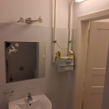 A vizesblokkok kialakítása praktikus: a fürdőszoba mellett egy különálló toalett is rendelkezésre áll. Az épület állapota rendezett, a lakóközösség csendes, a lépcsőház tiszta.