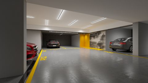 A lakáshoz két teremgarázs-beálló tartozik (20 M Ft/db), valamint egy nagyméretű, 14 m²-es tároló (10 M Ft).