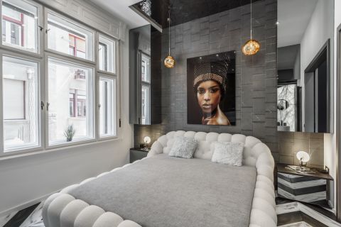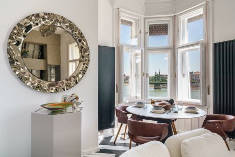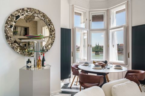 Eladó egy páratlan hangulatú, designer enteriőrrel berendezett, teljes dunai panorámás luxuslakás a Belgrád rakpart ikonikus épületében.