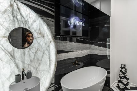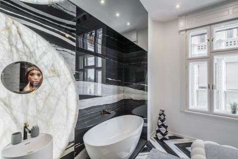 • egyedülállóan kialakított fürdőkád a hálószobában, mennyezetről leereszkedő TV-vel és dunai panorámával