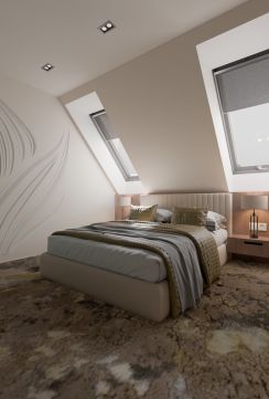 Egyedi belső kialakítás, választható burkolatokkal és berendezéssel, nagy belmagasság, a teljes tetőtér légterével.