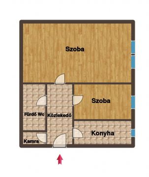 Az elrendezése praktikus: a tágas nappali mellett egy külön hálószoba, konyha, fürdőszoba és előszoba található. Földszinti elhelyezkedése miatt időseknek vagy kisgyermekes családoknak is ideális választás lehet.