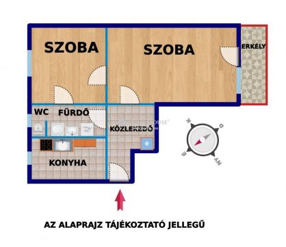 A praktikus elrendezésű lakás két tágas, külön bejáratú szobával rendelkezik, mely igény esetén összenyitható. A nagyobb szobához erkély is tartozik. A közlekedőben lévő beépített szekrény megszűntetésével egy tágasabb tér keletkezett. A fürdőszobában praktikus zuhanykabin kapott helyet, míg a WC fallal lett leválasztva. A mosógép is itt található.