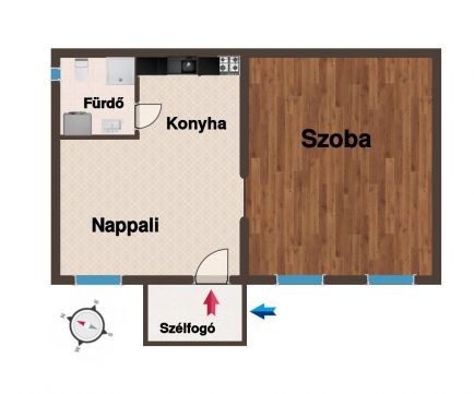 A 45 m2-es lakás egyedi adottsága a konyha, nappali, fürdő normál belmagasságú, míg a 3,6 m belmagasságú közel 23 m2-es nagyszoba galériázható .