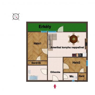 Elrendezés: nappali + 2 külön nyíló hálószoba