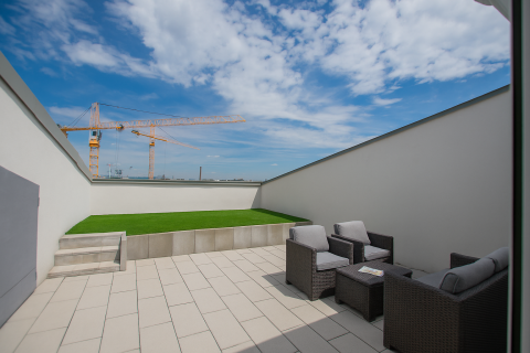 A lakás legnagyobb különlegessége a 36 m²-es, két szintre tagolt, részben térkövezett, részben füvesített terasz, amely ideális pihenésre, vendégfogadásra vagy akár kerti sütögetésekhez.