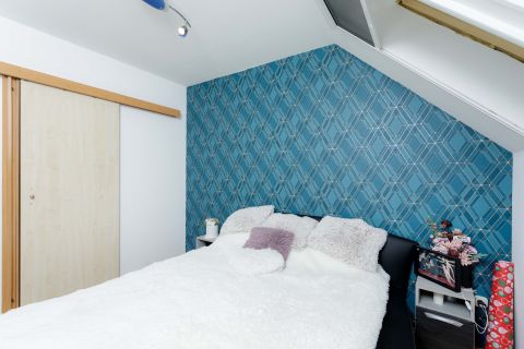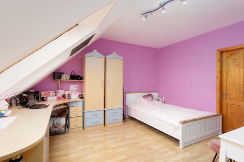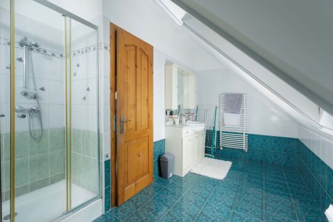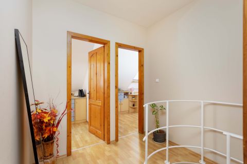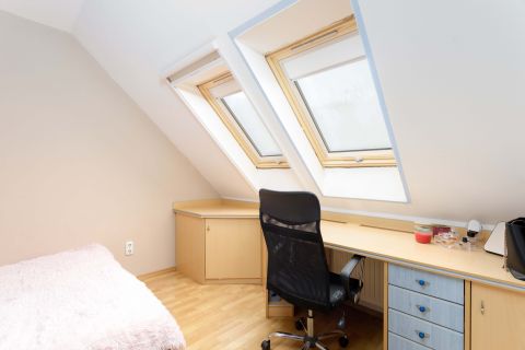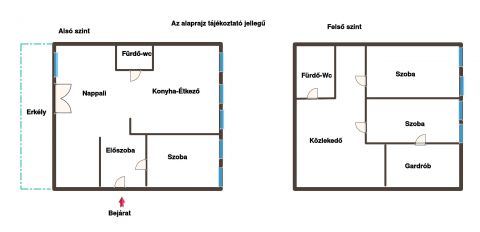 A felső szinten két kényelmes hálószoba, egy gardróbszoba (amely akár kisebb szobaként is használható), valamint egy zuhanyzós fürdőszoba WC-vel található.