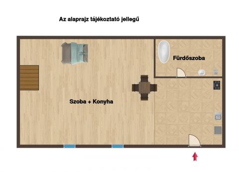 A galériának köszönhetően a lakótér praktikusan két szintre tagolódik, amely növeli a komfortérzetet és a használhatóságot.