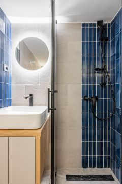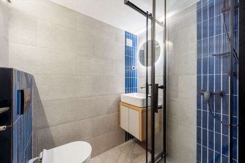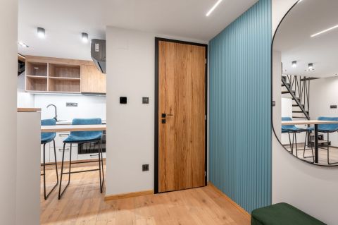 A lenti részen egy amerikai konyhás nappali, egy fürdőszoba.