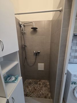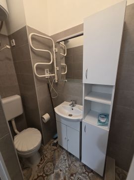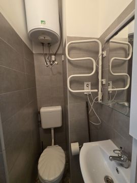 A melegvíz ellátása villanybojlerrel van megoldva. A fürdő és a WC egy helyiségben található és törölköző szárítóval.