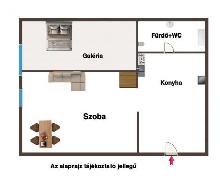 A lakás alapterülete 29 m2-es plusz egy 9,8 m2-es fekvő galéria van kialakítva.