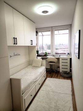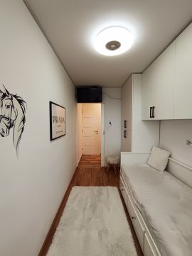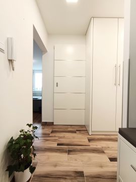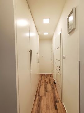 A nappaliból szeparált gardrób került leválasztásra, az előszobában és a közlekedőben pedig további beépített szekrények segítik a kényelmes tárolást.