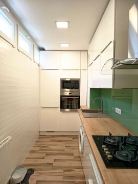 A konyhában asztalos által készített, minőségi beépített bútor kapott helyet, beépített gépekkel, amely nemcsak esztétikus, hanem hosszú távon is kényelmes megoldást nyújt.