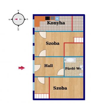 A lakás elrendezése praktikus: egy szoba + nappali, fürdőszoba WC-vel és a 9 m²-es konyha egyben étkezőként is funkcionál, ráadásul galériázott, ahogy a nappali és a egyik szoba is. A galériák összesen (13 nm) jelentős plusz teret adnak a lakáshoz, jól kihasználhatóak hálórészként, dolgozósarokként vagy tárolásra.