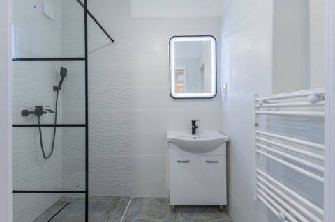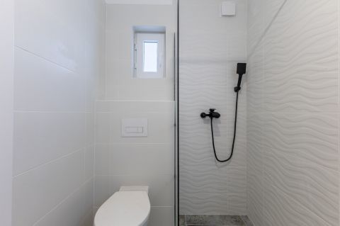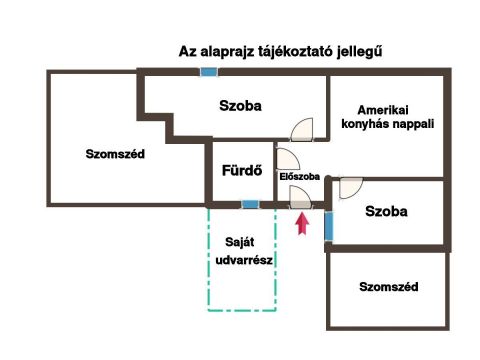 A lakás 50 négyzetméteres alapterületén megtalálható egy előszoba, amerikai konyha nappalival, fürdőszoba WC-vel és a két szoba. A szobák és az előszoba aljzata minőségi laminált parkettával fedett, az amerikai konyhás nappali, a legmagasabb fokú, kopás és víz álló laminált parkettával borított. A fürdőszoba kerámia lappal burkolt és csempézett.