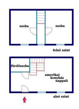 Alsó szintjén amerikai konyhás nappali és egy fürdőszoba került kialakításra. A felső szinten 2 különnyíló hálószoba kapott helyet, mindkét szoba egy kisebb (padlótól számítva kb. 50 cm magas) ablakkal is rendelkezik, melyek az udvarra néznek.