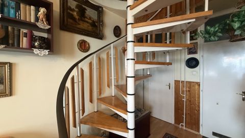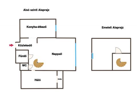 - a felső szinten egy hálószoba, melyet a nappaliból közelíthetünk meg egy csigalépcsőn keresztül.