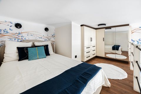 Alsó szint alapterülete 19,75 nm, míg a felső tér, ahol az ágy is van 9,43 nm-es teret kapott. Belmagasságának köszönhetően szinte kompromisszumok nélkül otthon lett. Minőségi kivitelezés és felújítás alap a jelenlegi tulajdonosnál. A kis lakások osztatlan közös tulajdonúak, a három apartman 1 helyrajzi számon van, teljesen külön mérő egységekkel. Ügyvédi és földhivatalban is rögzített megosztási szerződéssel.
