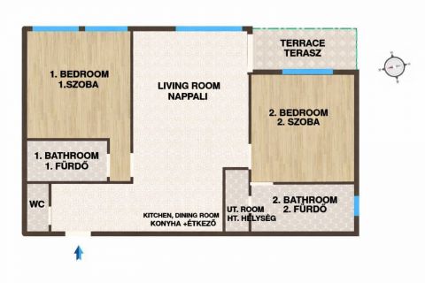 tágas amerikai konyhás nappali, két külön hálószoba saját fürdőkkel, vendégmosdó, külön háztartási helyiség mindez logikusan, jól élhetően kialakítva.