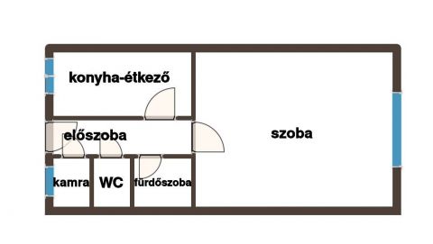 előszoba, tágas, 20 m²-es szoba, konyha-étkező, kamra, valamint külön fürdőszoba és WC kézmosóval. Az ingatlan közepes állapotú, így igény szerint könnyen saját ízlésre formálható.