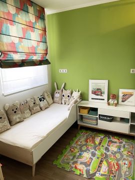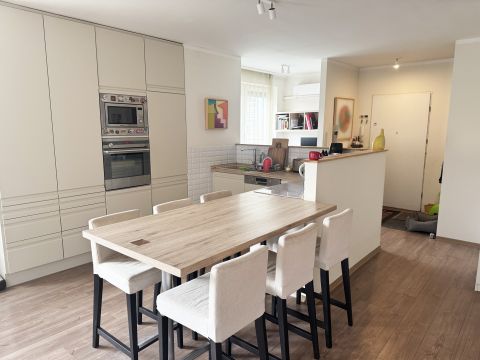 A lakás központi eleme a sok ablakos, rendkívül világos nappali, amely közvetlen kapcsolatban áll a hatalmas, zöld tetőterasszal ideális pihenésre, vendégfogadásra vagy akár családi programokra.
