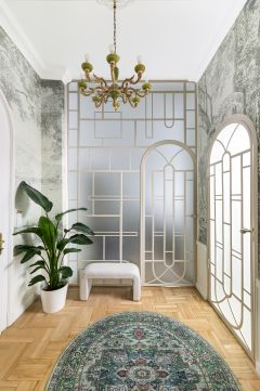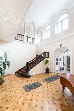 Az utcai bejárat felől a lakás földszintinek hat, azonban a hegy lejtéséből adódóan a lakószobák már első emeleti magasságban helyezkednek el, így az intimitás és a biztonság is adott. A dupla komfortos lakás egy impozáns közös előtérből közelíthető meg, amely egykor a villa báltermeként funkcionált, és máig őrzi eredeti, patinás hangulatát.