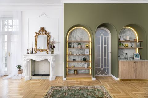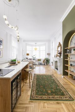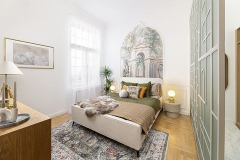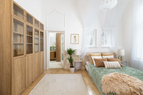 A 93 m² alapterületű lakás nappali + 2 hálószobás elrendezésű, két teljes értékű fürdőszobával rendelkezik, és nemrégiben esett át egy átgondolt, elegáns stílusú felújításon. A lakás a hajdani villa legreprezentatívabb helyiségeiben kapott helyet, amely azonnal érezhető a tágas terekben és a kiemelkedő, 365 cm-es belmagasságban.