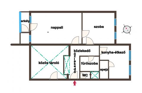 A lakáshoz tartozik egy közös használatú tároló, közvetlenül a bejárat mellett kényelmes megoldás a mindennapokban.