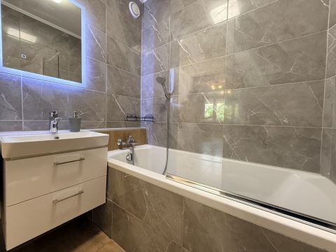Fürdőszoba: Igényes burkolatok, kényelmes kád és minőségi GROHE csaptelepek.