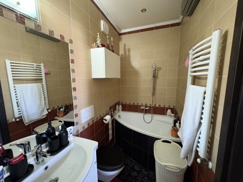 Esztétika: Igényes, modern burkolatok és minőségi kivitelezés jellemzi az egész lakást, a fürdőszoba sarokkáddal felszerelt.