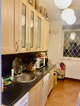 A bejárati ajtóból tágas előtérbe érkezünk. Az előtérből nyílik minden más helyiség. Balra található a teljesen gépesített konyha: mosó- és mosogatógép, kombi hűtő, tűzhely (gáz főzőlap, elektromos sütő), mikró.