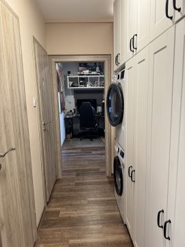 A közlekedőben található beépített szekrénysor, nem csak ideális az egész család ruhatárának tárolására, de a vételár részét is képezi.