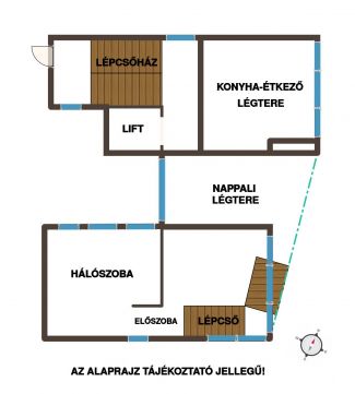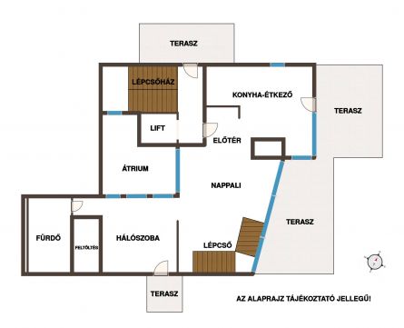 Az alsó szinten tágas nappalikonyha, hálószoba, gardrób, fürdőszoba és három külön terasz található. A felső szint egy szeparált hálót, gardróbot és fürdőszobát kínál. A galériás háló külön látványossága a nagyméretű üvegfal, amelyről az egész lakótér rálátható modern, karakteres és igazán egyedi építészeti elem.