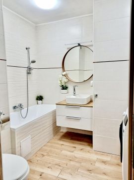 A fürdőszoba és a WC egy helyiségben kapott helyet.