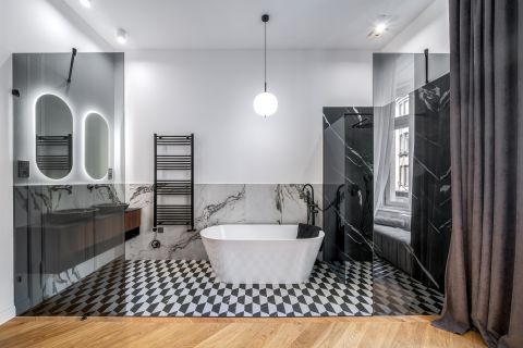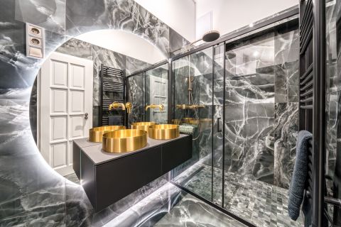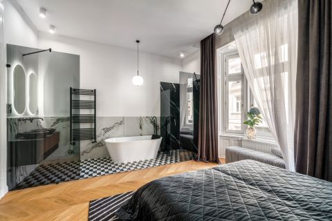 A gondosan megtervezett elrendezésnek köszönhetően a lakásban két tágas master hálószoba kapott helyet, egymástól elszeparálva, a lakás két végében, mindegyik saját, dupla mosdóval felszerelt fürdőszobával és beépített gardróbszekrénnyel.
