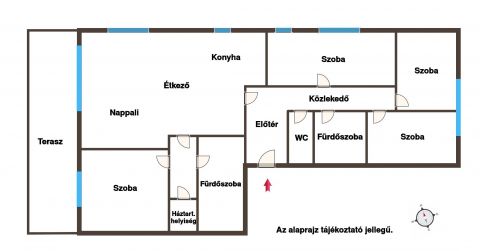 - Elosztás: Amerikai konyhás nappali + 4 külön nyíló hálószoba.